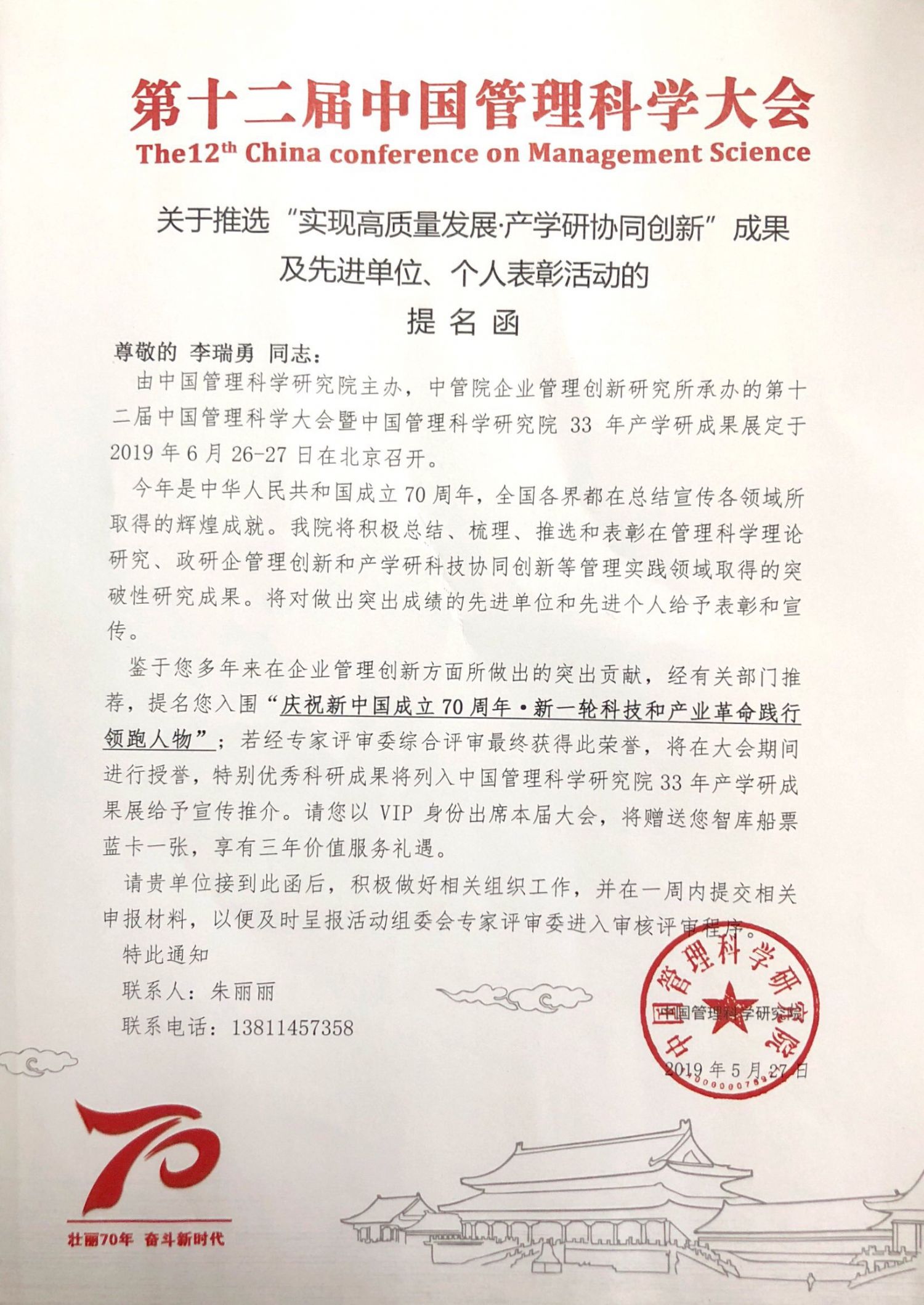 由中國管理科學研究院主辦,中國管理科學研究院企業管理創新研究所承辦,北京新聞文化研究所、發現雜志社聯辦的第十二屆中國管理科學大會將于6月26日在北京召開。大會將圍繞“新中國成立70年周年管理科學輝煌成就”、“產學研協同創新”、“新時代高質量發展”三大領域及相關課題展開深入探討。我司董事長李瑞勇先生以中國企業家創新智庫特聘專家身份受邀參加。